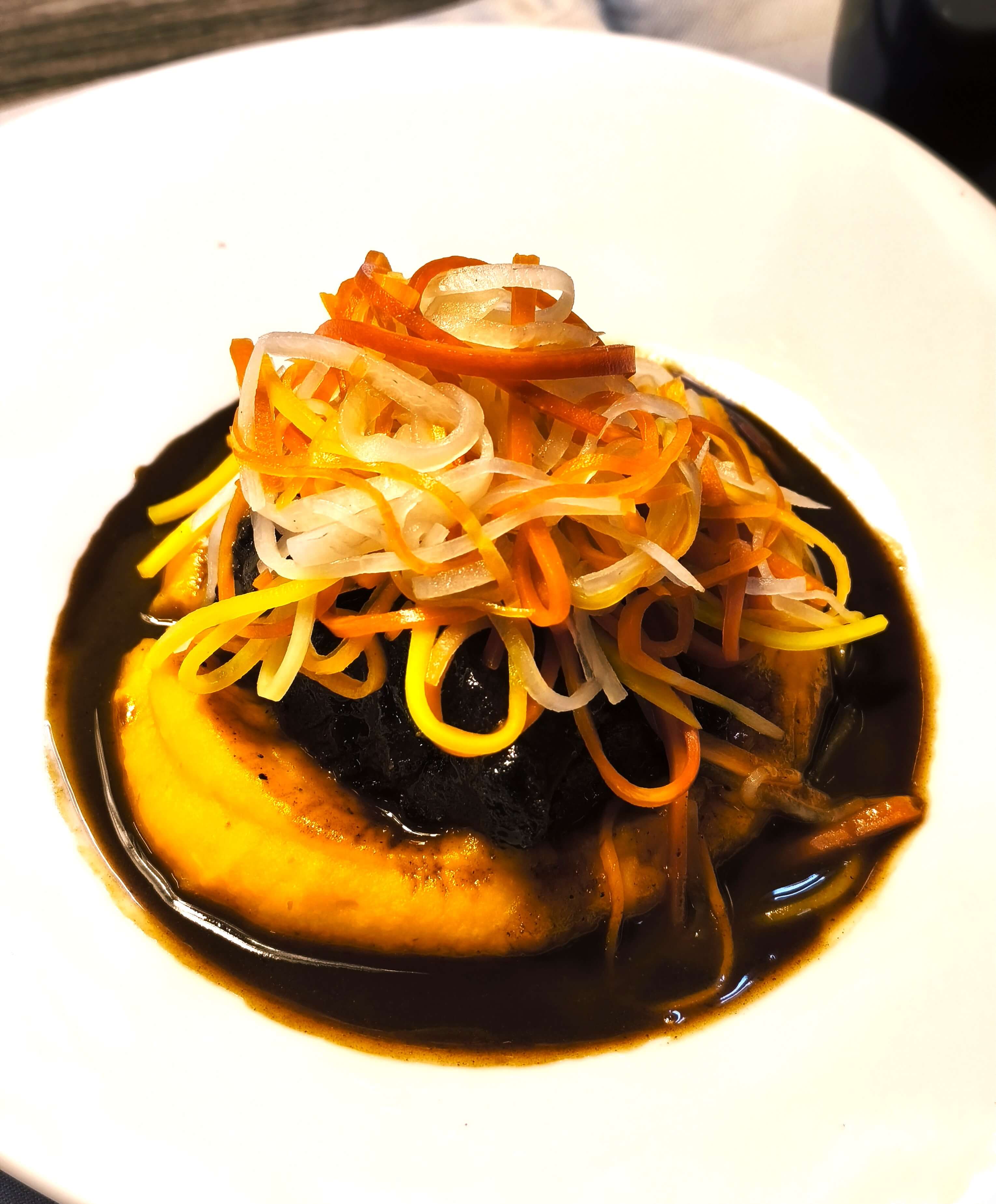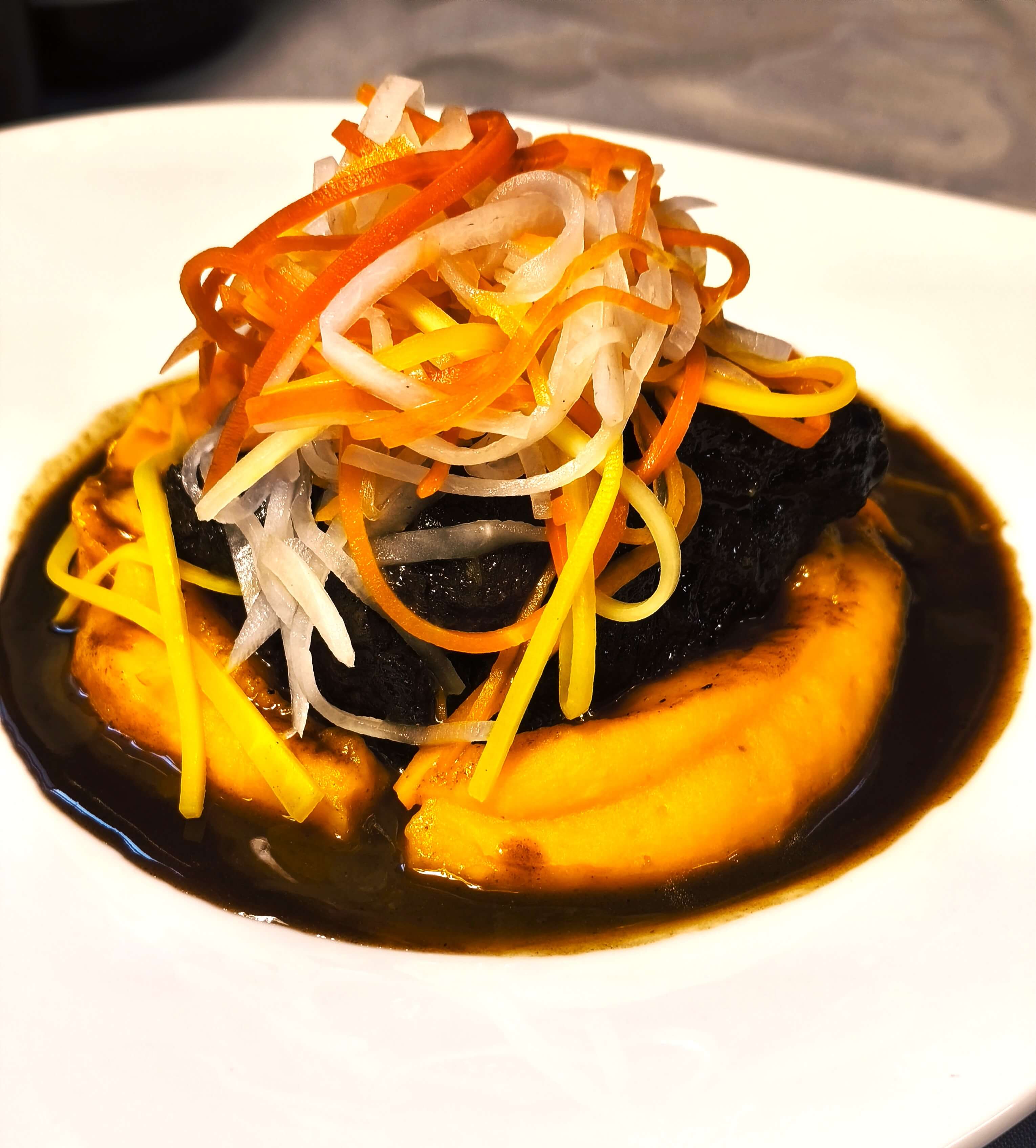 Ein cremiges Kürbis-Kokospüree, abgeschmeckt mit frischem Ingwer und spritzigem Limettensaft, bildet das harmonische Gegengewicht zum kräftigen Fleisch. Dazu gesellt sich ein buntes Ensemble aus dreierlei Karotten und zartem Rettich – kunstvoll drei Tage in einer würzigen Lake aus Ingwer, Limettenblättern, Reisessig und Chili eingelegt. So entsteht ein Spiel aus Süße, Säure und angenehmer Schärfe.