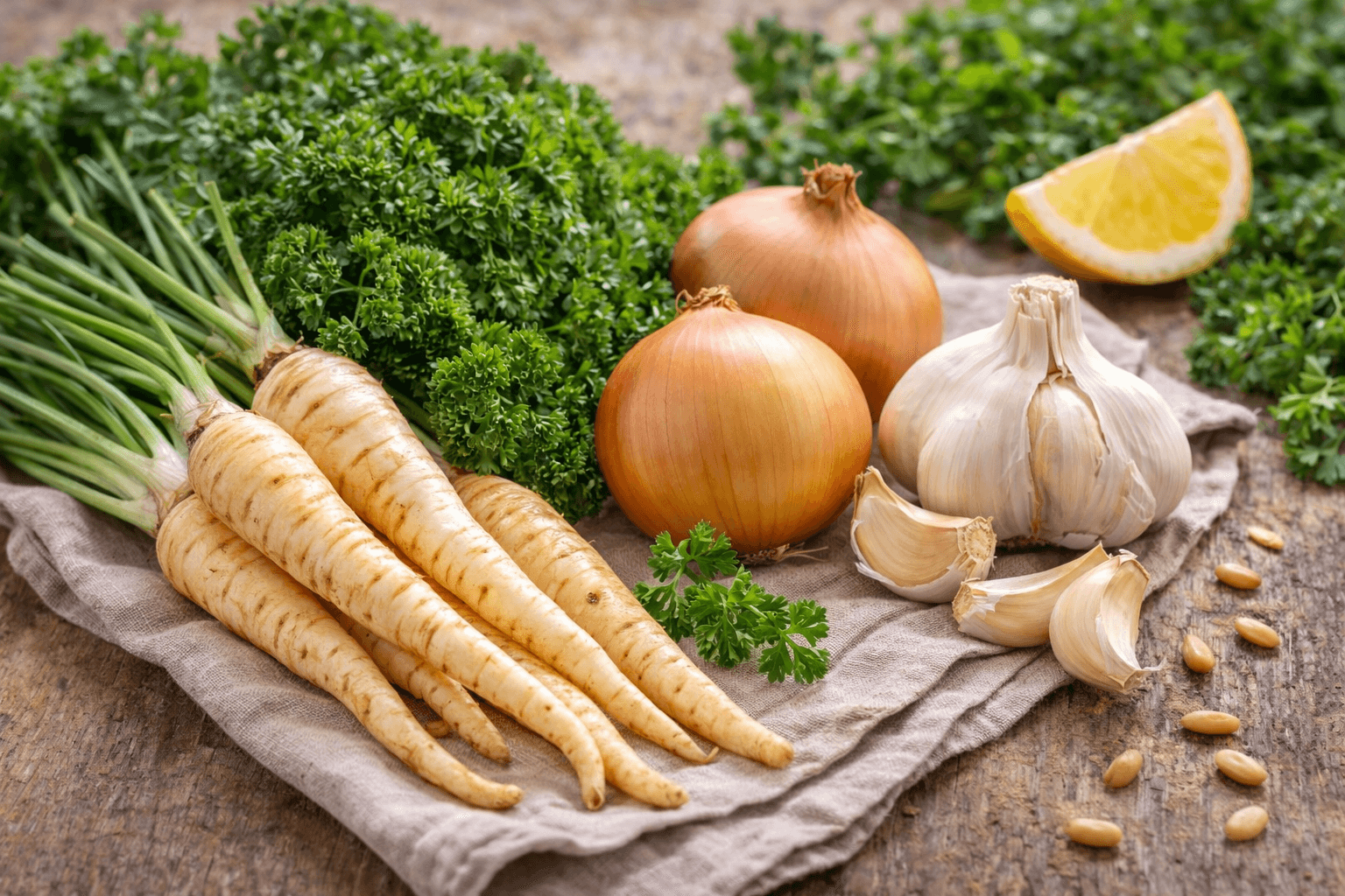 Inspiriert von meiner Zeit als Chef Saucier, Entremetier und Gardemanger bei 3-Sterne-Koch Heinz Winkler und verfeinert durch die Zusammenarbeit mit weiteren Sterneköchen, vereint diese Suppe das Beste aus zwei Welten: die erdige Tiefe der Petersilienwurzel und die frische, leuchtende Intensität des Petersilienblatts.